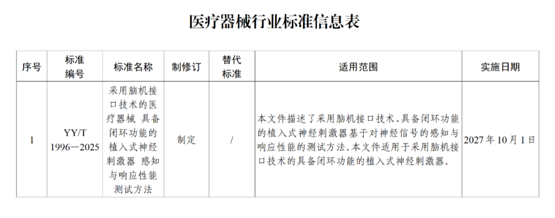國家藥監(jiān)局關(guān)于發(fā)布YY/T 1996—2025《采用腦機接口技術(shù)的醫(yī)療器械 具備閉環(huán)功能的植入式神經(jīng)刺激器 感知與響應(yīng)性能測試方法》醫(yī)療器械行業(yè)標(biāo)準(zhǔn)的公告