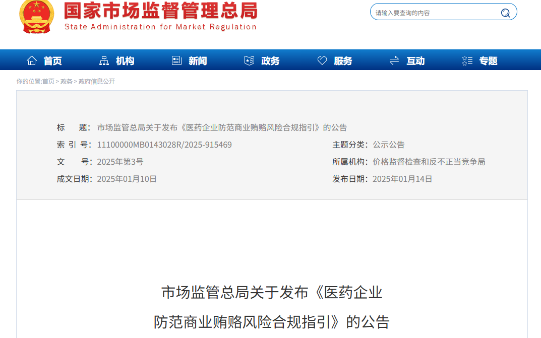 1月14日,市場監(jiān)管總局官網(wǎng)正式發(fā)布《醫(yī)藥企業(yè)防范商業(yè)賄賂風(fēng)險合規(guī)指引》(以下簡稱《指引》)。