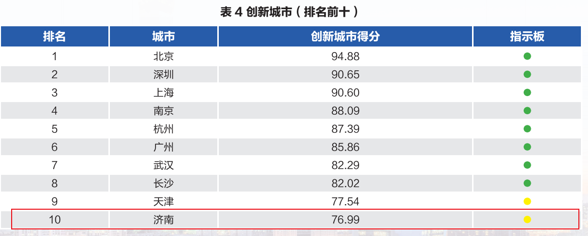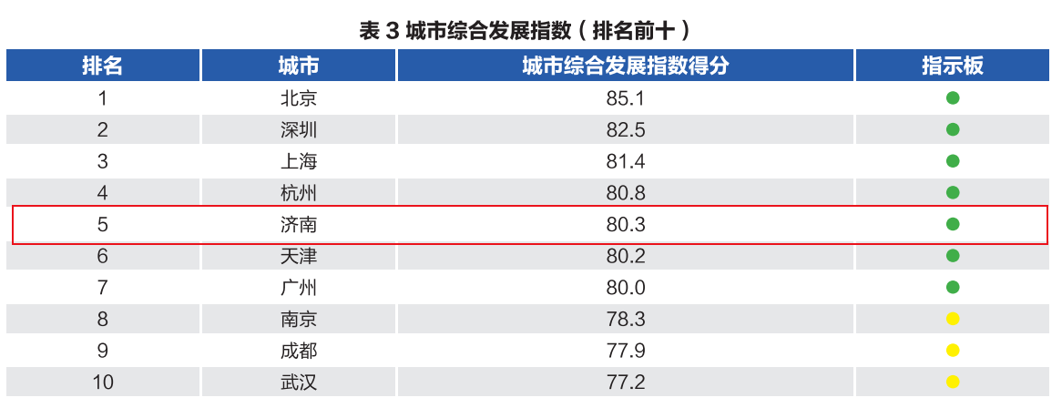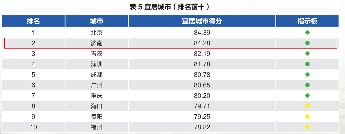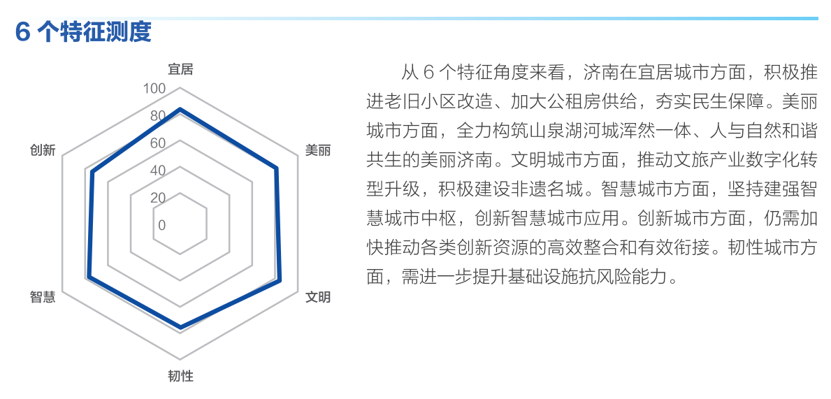 《報(bào)告》從創(chuàng)新城市、宜居城市、美麗城市、韌性城市、文明城市、智慧城市等6個(gè)維度展開(kāi)評(píng)價(jià)。濟(jì)南在創(chuàng)新、宜居、韌性、文明、智慧等5個(gè)維度中排名前十,其中,在“宜居城市”中排名第二,在“創(chuàng)新城市”中排名第十,在“韌性城市”中排名第六,在“文明城市”中位列第八,在“智慧城市”中排名第九。