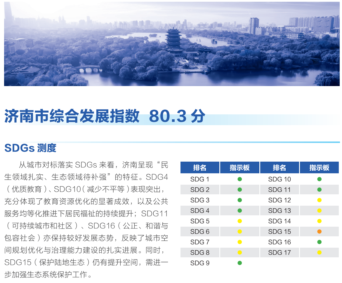 從城市對(duì)標(biāo)落實(shí)SDGs來(lái)看,濟(jì)南“民生領(lǐng)域扎實(shí)”的特征明顯,SDG4(優(yōu)質(zhì)教育)、SDG10(減少不平等)表現(xiàn)突出,充分體現(xiàn)了教育資源優(yōu)化的顯著成效,以及公共服務(wù)均等化推進(jìn)下居民福祉的持續(xù)提升;SDG11(可持續(xù)城市和社區(qū))、SDG16(公正、和諧與包容社會(huì))亦保持較好發(fā)展態(tài)勢(shì),反映了城市空間規(guī)劃優(yōu)化與治理能力建設(shè)的扎實(shí)進(jìn)展。